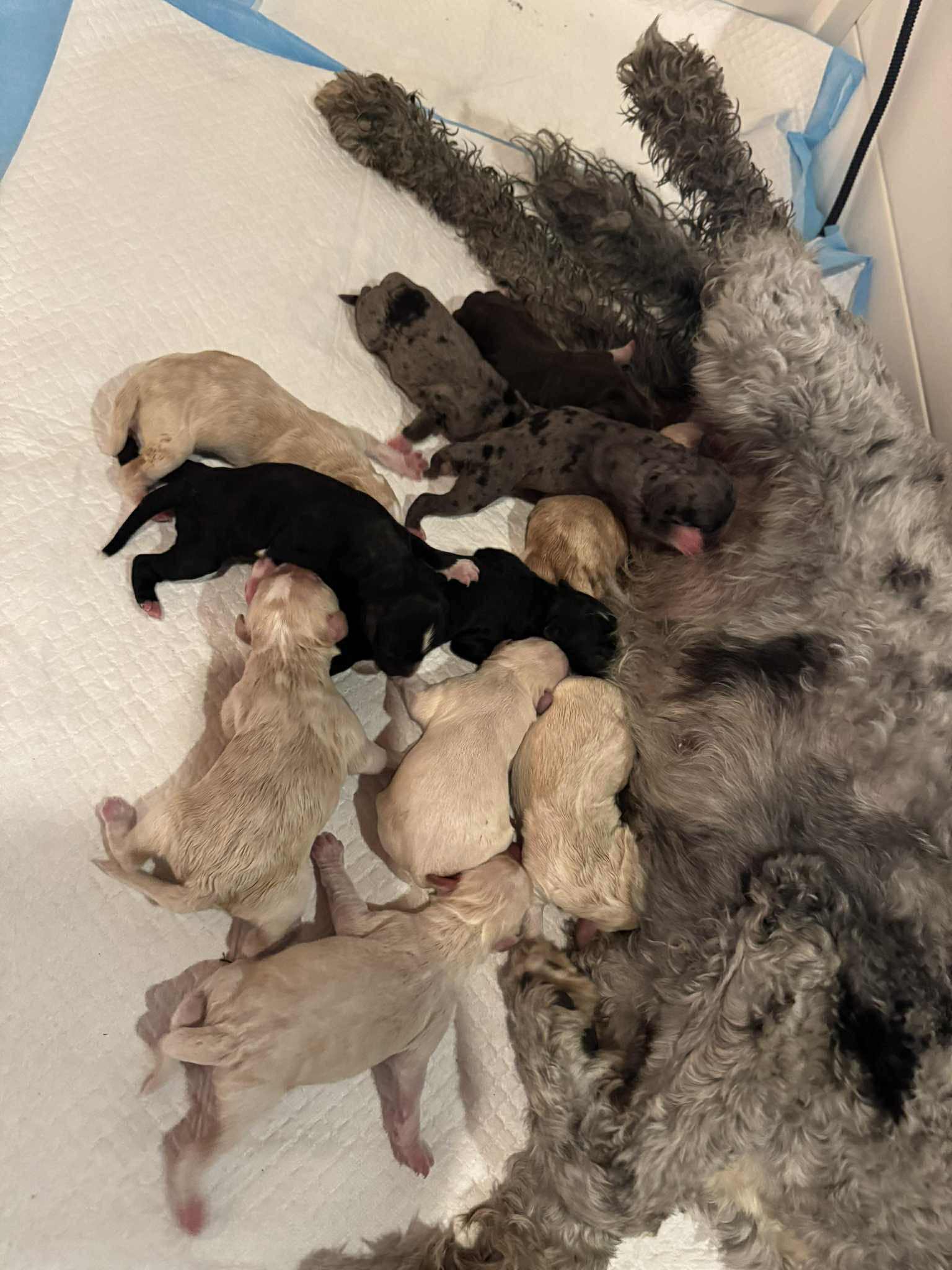 Congratulations Bluey and Mac on litter of 12, 5 females and 7 males, born 09/05/2025, minis-small medium-medium sizes expected, go home November!